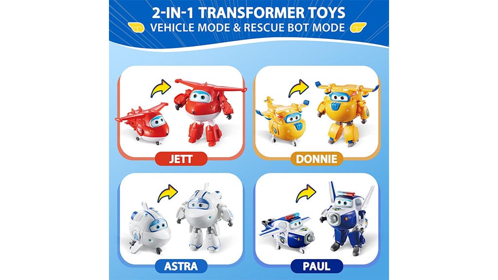 Acest pachet de patru Super Wings conține pe Jett, Paul, Astra și Donnie. Figurinele de cinci inci pot fi transformate cu ușurință din modul robot în modul avion și invers. Aceste jucării detaliate și rezistente sunt perfecte pentru jocuri creative și îi ajută pe copii să retrăiască scenele preferate din serial, dezvoltându-și în același timp abilitățile motorii fine și imaginația.