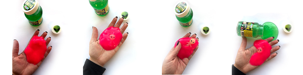 Celălalt este un roz strălucitor, deja ușor, în care era ascunsă o creatură extraterestră mititică. Materialul său se simte de asemenea, umed la început, dar încă arată uscat. Aceste produse Slime leagă chiar și adulții pentru o lungă perioadă de timp, chiar și copiii.
