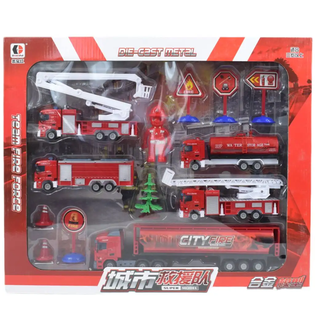 Conținutul setului de jucării pentru stingerea incendiilor este extrem de bogat și variat. Setul include: un camion, două autospeciale de pompieri cu scări, o mașină de pompieri cu rezervor, o mașină de pompieri, două blocaje rutiere, patru semne diferite, o figurină și un element din lemn. O varietate de vehicule și numeroase accesorii oferă copiilor posibilitatea de a-și dezlănțui creativitatea și imaginația și de a juca o varietate de misiuni de salvare.