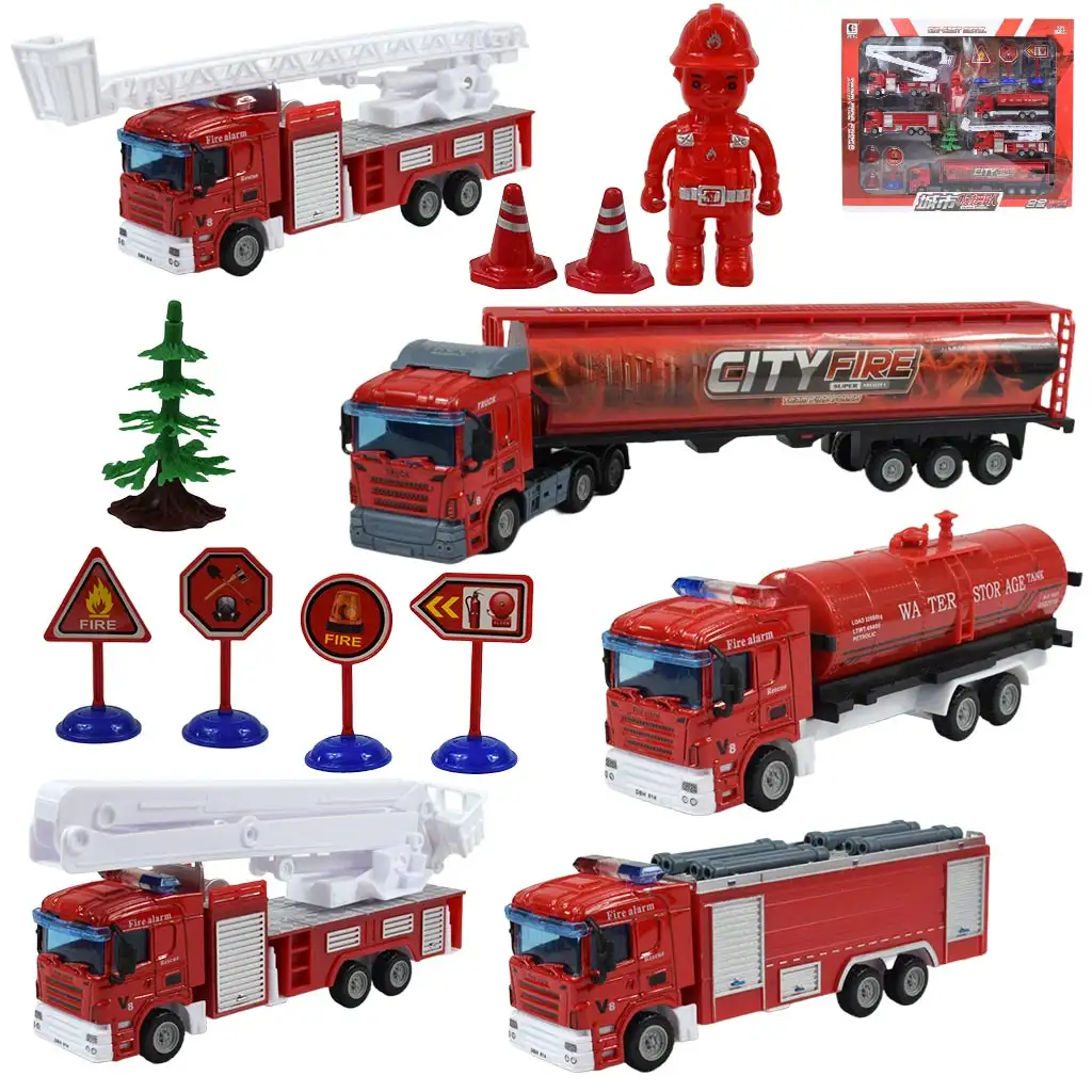 Acest impresionant set de joacă de pompieri include toate elementele esențiale pentru o stație completă de pompieri. Setul include vehicule importante precum mașina de pompieri, dintre care trei versiuni sunt disponibile - camion cu scară, camion cisternă și remorcă de camion. Aceste vehicule recreează cu fidelitate echipamentul unui adevărat departament de pompieri și le permit copiilor să experimenteze lumea captivantă a pompierilor.