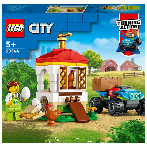 Du copiii în aventuri distractive ale fermei cu acest set de jucării LEGO® City Hen (60344), care include o găină coteț cu uși care se deschid și o tavă de colectare a ouălor, un vehicul de teren elegant (ATV) cu direcție înclinată și 2 accesorii distractive, cum ar fi ouă și o ladă care se potrivește în spatele ATV-ului. Doar adăugați o minifigurină de fermier și 2 figurine de pui și jocul poate începe!
