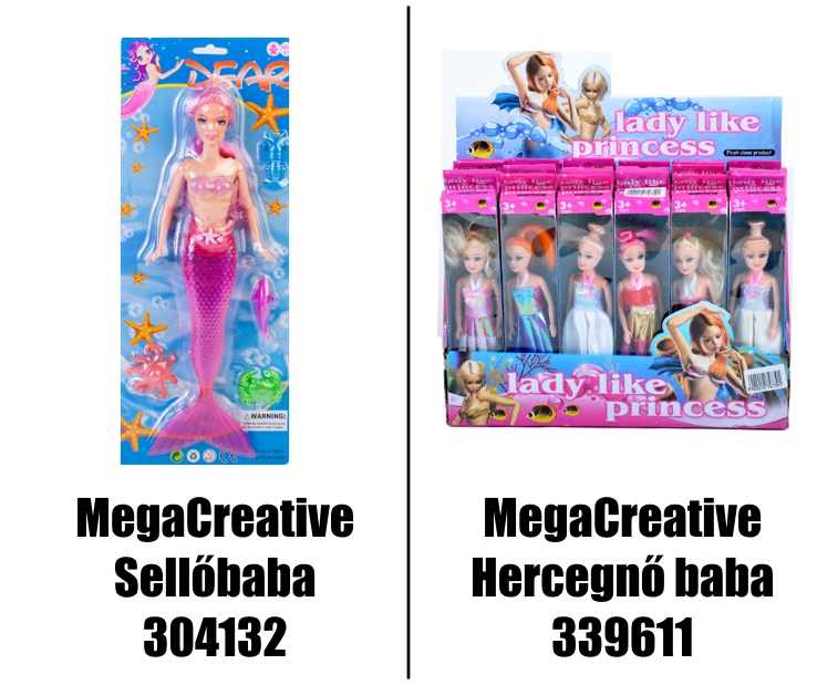 În timpul inspecției Inspectoratului General pentru Protecția Consumatorilor, sa constatat că păpușa MegaCreative Mermaid cu numărul de cod 304132 și păpușa MegaCreative Princess cu numărul de cod 339611 prezentate mai jos au un conținut DEHP care depășește valoarea limită de sănătate.