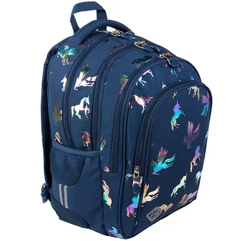 Alege ghiozdanul extraordinar pentru fetița ta, care nu este doar estetic, ci și extrem de practic și confortabil. Geanta de un albastru intens decorat cu designul Holo Unicorns este o alegere perfecta pentru copii din toate punctele de vedere. Designul genții are spatele căptușit și curele de umăr largi, reglabile, ceea ce o face extrem de confortabilă pentru copii. Geanta de școală este realizată din material impermeabil de calitate și oferă opțiuni practice de depozitare, cu mai multe compartimente mari și buzunare cu fermoar pentru cărți și caiete, precum și un buzunar lateral din cauciuc pentru o sticlă de apă. In plus, talpa ranforsata asigura longevitatea gentii.
