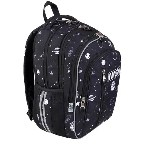 Geanta de școală decorată cu inscripția NASA și diverse planete arată minunat! Geanta este o alegere excelentă pentru copii, deoarece pe lângă culoarea și modelul unic, geanta se mândrește și cu un design confortabil și practic. Este confortabilă pentru copii datorită spatelui căptușit și a curelelor de umăr reglabile și largi. Geanta de școală din material de calitate superioară, impermeabilă, este și ea practică la depozitare, deoarece are mai multe compartimente mari și buzunare cu fermoar pentru cărți și caiete, precum și un buzunar lateral din cauciuc pentru sticlă. Nu în ultimul rând, sunt foarte utile și partea de talpă întărită și modelele reflectorizante care asigură siguranță.