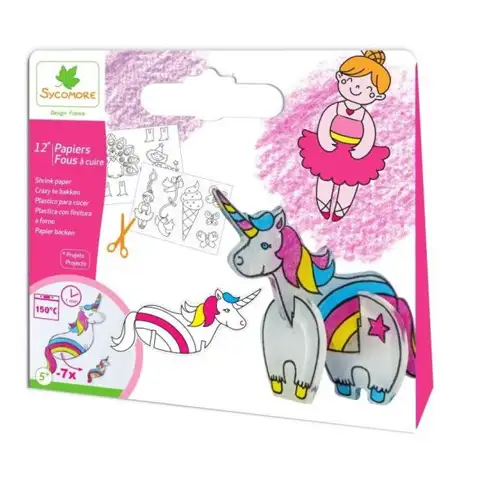 Acest model poate fi un cadou cu adevărat grozav pentru toți copiii care iubesc jucăriile creative. Setul contine 12 figurine diferite imprimate, care pot fi colorate dupa dorinta si decupate cu foarfeca. Mamele pot fi apoi implicate și în joc, deoarece figurinele decupate trebuie introduse în cuptor pentru un minut pentru a se transforma și a se întări atunci când sunt expuse la căldură. Imediat ce figurinile s-au micsorat, copilul tau poate să agațe de un colier sau chiar sa iti decoreze camera cu el, dar poate fi si un cadou excelent pentru prieteni si membri ai familiei.